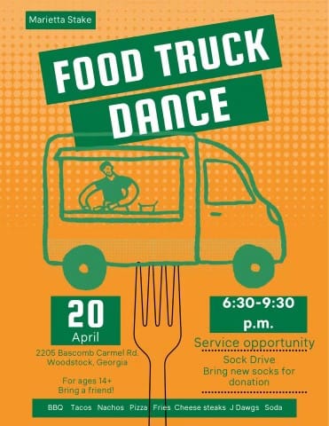 We are pleased to announce the upcoming Marietta Stake Food Truck Dance, April 20th, 2024!